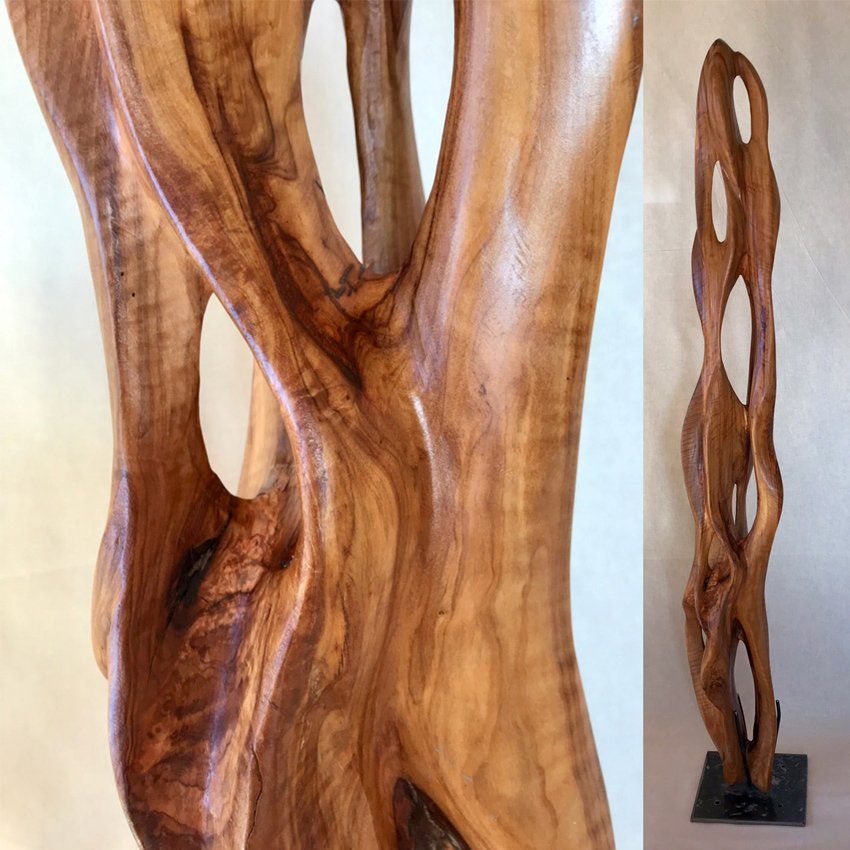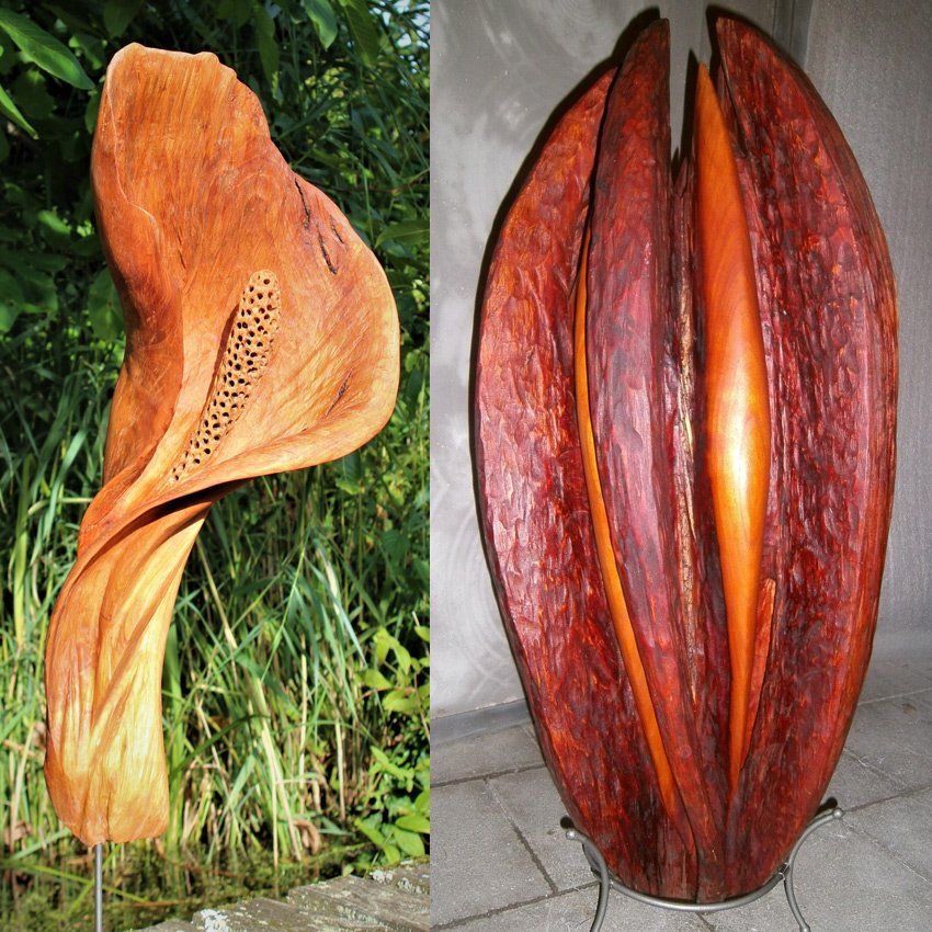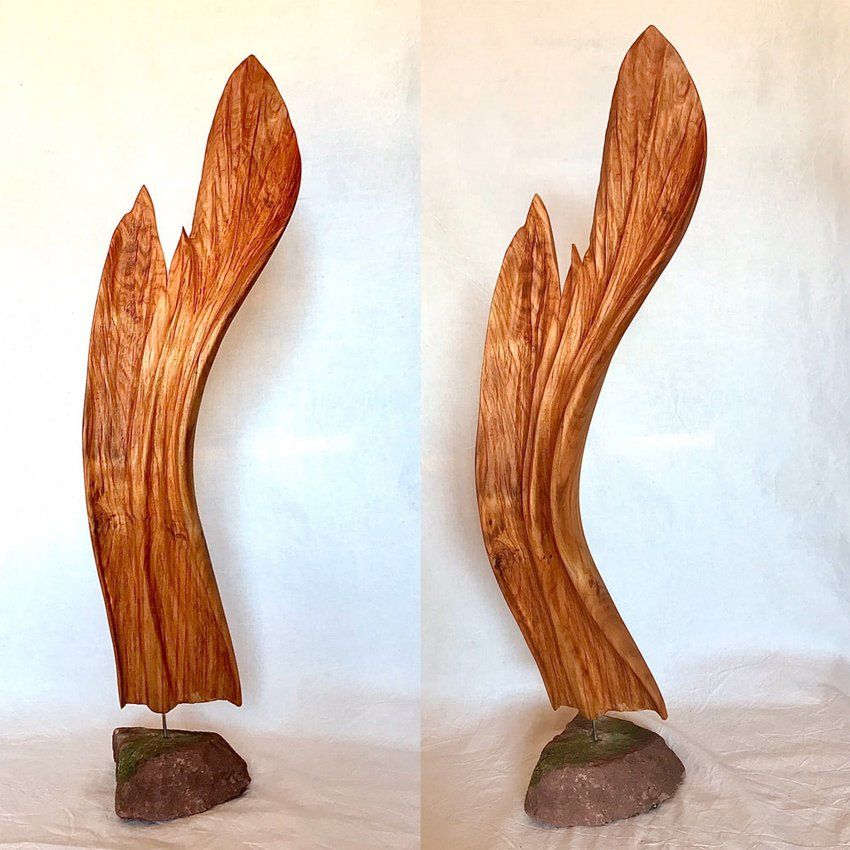 Bei den Skulpturen folge ich den gedrehten verwachsenen Formen des Holzes. Das gegebene Grundmaterial bestimmt die Form der Skulptur mit. Dieses teils unvollkommene Holz macht gerade seine Schönheit aus. Je älter, verästelter und auch „kaputter“ das Holz, desto stärker und interessanter ist dessen Zeichnung. Morsches wird abgeschlagen, Risse tauchen auf und führen in die Tiefe. Darauf reagiere ich. Es ist ein Dialog zwischen dem Material und mir. Ich versuche die Eigenarten zu respektieren, Textur hervorzuheben und dessen Schönheit zu betonen. Die Idee der Form bleibt als Stachel im Sinn. Blätter (Feuerblumen) arbeite ich hauchdünn bis teils schon transparent heraus. Es entsteht eine äußerste Leichtigkeit.